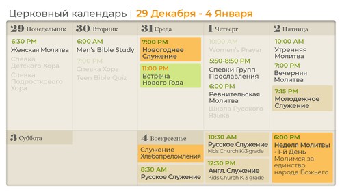 5:50 PM Тренировки Групп Прославления 6:00 PM Школа Русского Языка